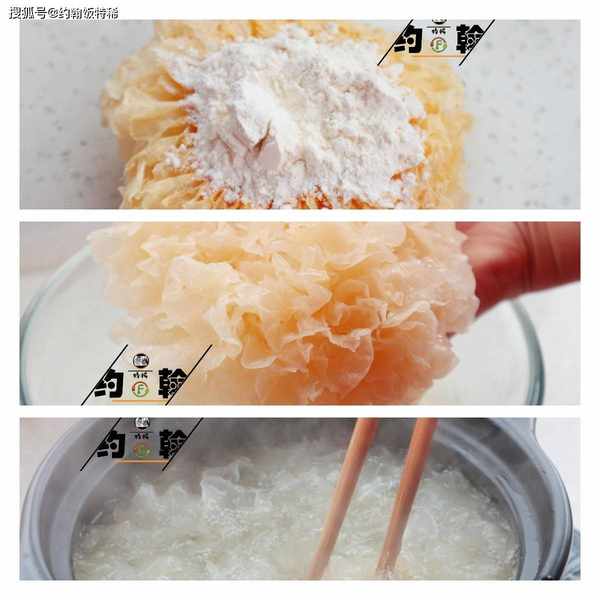 1:将银耳整块放入容器中,加上少许食盐和面粉浸泡10分钟。食盐可以有效地杀菌,而面粉可以吸附表面的杂质,这样洗出的银耳才更干净。