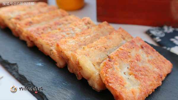 7:平底锅或者电饼铛刷上一层薄油,开小火将萝卜糕放进锅内,勤翻面煎至两面金黄即可出锅。