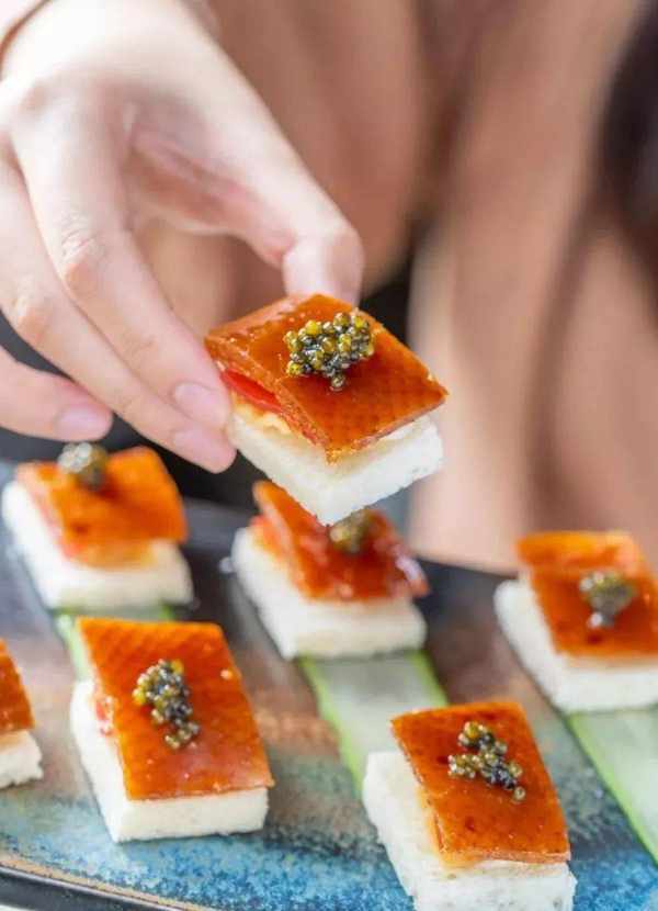 鱼子酱、鸭皮、自制吐司片