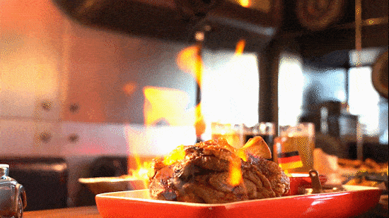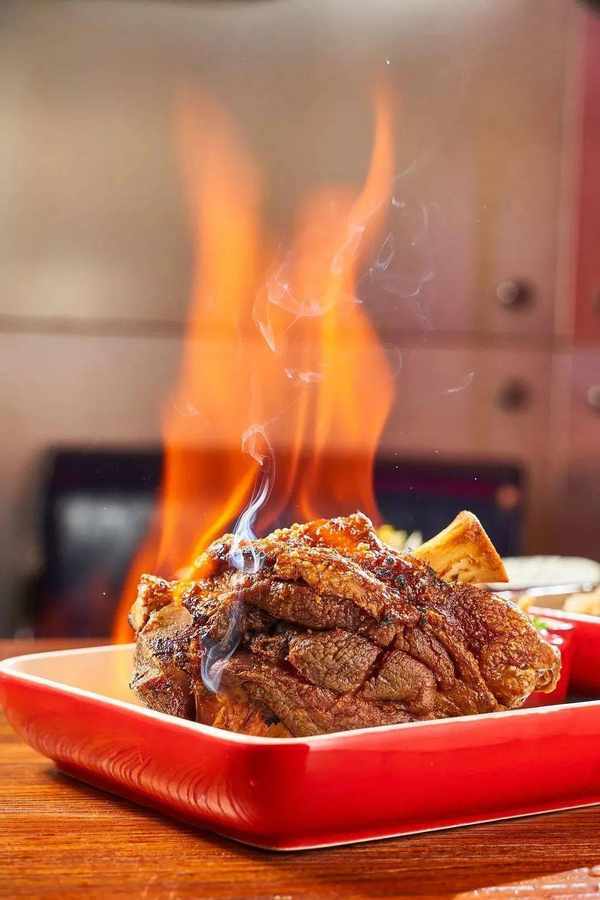 火焰烤猪肘点燃的瞬间