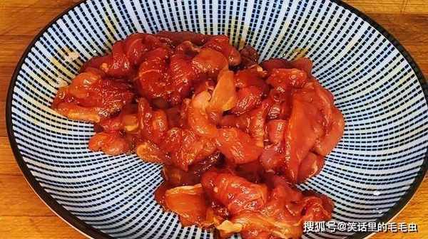 3.猪瘦肉切薄片放入盘中,依次放食盐、生抽、蚝油、胡椒粉、生粉,抓匀后放一旁腌制。