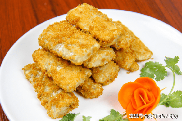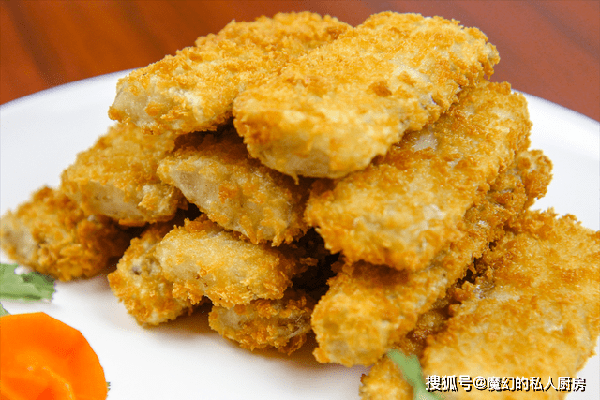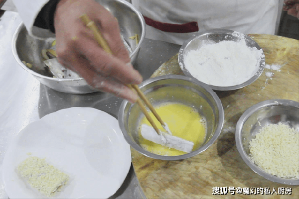 准备三个小盆,一个打入鸡蛋,一个放干淀粉,一个放面包糠,把腌好的带鱼先沾上淀粉,再浸好蛋液,最后沾上面包糠,一块一块地处理好,放在盘子里备用。