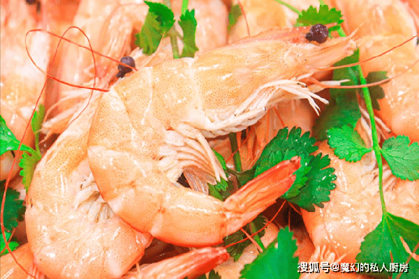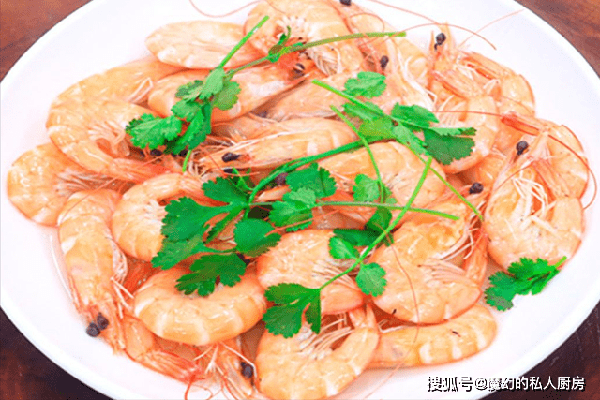 然后挑出锅中的葱姜,把大虾捞出来摆放在盘中,淋上一勺煮虾的原汤,撒上香菜、美味即成。