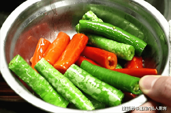 锅内多烧一些油,油温五成热时先放大蒜炸一下,闻到蒜香味以后放入青红线椒也快速过一下油,方便后期快速炒熟,还能保持鲜艳的色泽。