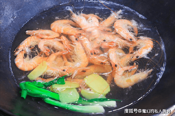 锅内烧水,放入姜片和葱段、淋入料酒去腥,水烧开以后倒入大虾,煮至虾身变红,加入一点食盐入味,整个煮制时间不要超过1分钟,以免虾肉变老。