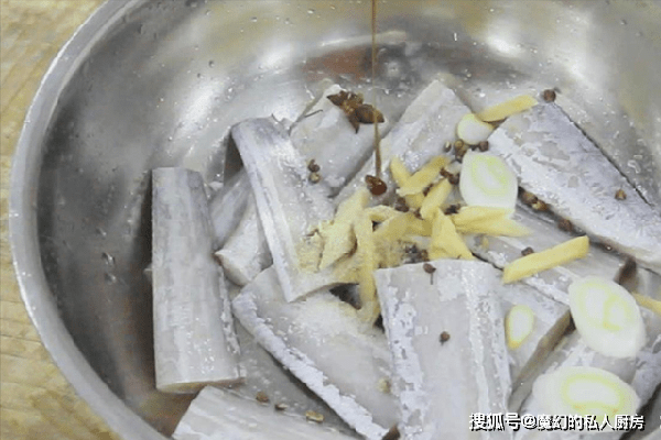 带鱼三条,划去鱼鳍,切掉鱼头,掏去内脏,然后用水洗干净,切成7到8厘米的长段放入盆中,加入葱花、姜丝、一小撮花椒、一个八角、一小勺食盐、一小勺胡椒粉、一点蚝油、淋入料酒,抓拌均匀腌制5分钟去腥码味。