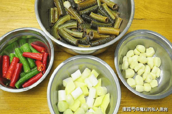 青红线椒也切成一字连刀、再切成段;大葱切圈、生姜切粒、大蒜一切二备用。