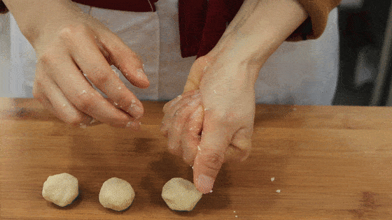 之后把油酥掰成20克左右的剂子,数量要和油皮的数量保持一样多。然后把油酥放在手心里,也团成团,再用保鲜膜盖住松弛10分钟。