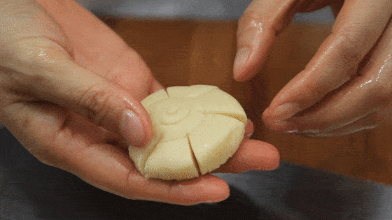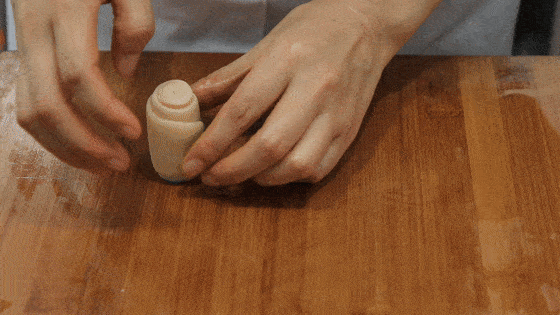 之后用擀面杖把它擀成一个小圆饼,并用刀在四周切上几刀,再用两个手指捏起来,就能捏出一朵梅花的形状用。随后用这个方法,把全部的油酥卷切好捏出花来,再用筷子把每个梅花上面点个花,滴上一滴鸡蛋黄备用。