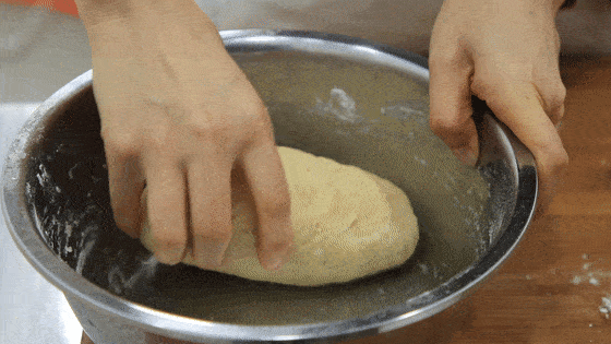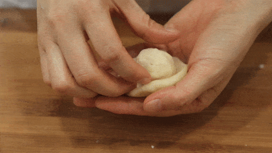 10分钟以后,取一块油皮面团,并把油酥包起来。面团的话要慢慢的拉伸,收口处也一定要收好,不要把油酥露出来。