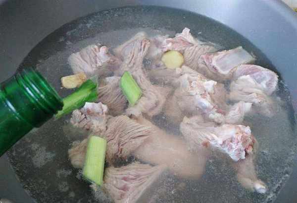 1,把排骨洗干净,砍成小块。锅中放入半锅清水,把水烧开后,放入姜片、排骨和葱段,接着再倒入少许料酒或者白酒,保持大火焯水5分钟。