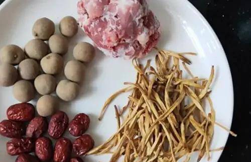 准备食材:排骨1-2根、干黄花菜一小把、桂圆14-16个、红枣10-12粒、生姜、料酒、食盐适量。