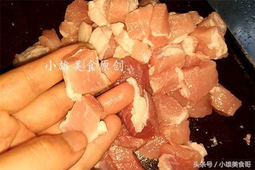 1、首先我们需要用到一斤的五花肉,然后把肉皮给去掉。用刀切成这样的小块,当然你也可以切成小条哦。