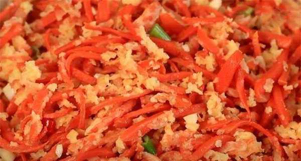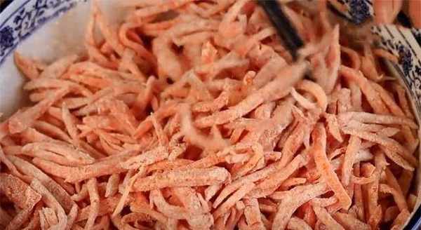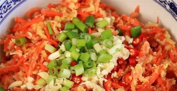 7、底下炒一些花椒油,油热后将花椒放入锅中,淋上花椒油,搅拌均匀,拌匀后即可食用,胡萝卜做法简单,营养又好吃,试试吧喜欢的话在家试试吧。