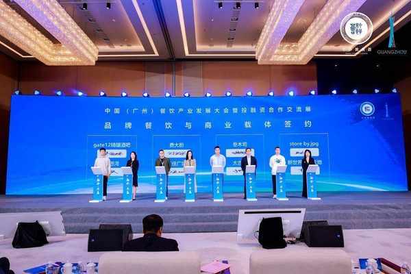 记者在会上了解到,费大厨广州首店、呷哺呷哺集团新品牌趁烧广州首店、澳门品牌gate12精釀酒吧广州首店、广州酒家、叁木司Bistro,天鸟居酒屋、怂火锅、佬麻雀高端品牌雀园、store by.jpg、TIMS咖啡、台湾美食文创城等一批餐饮投资项目现场与商业载体签约。