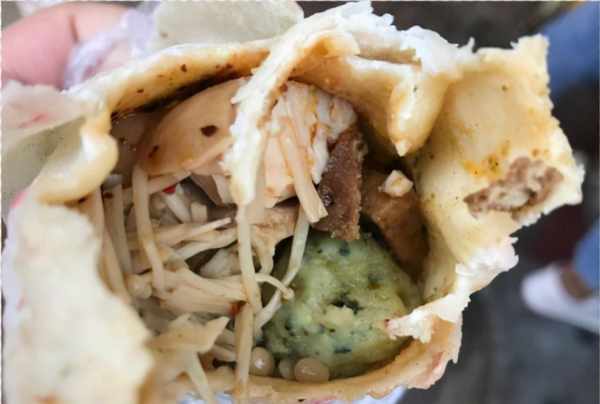 外层就是单饼,这是山东的传统面食,薄厚适中,吃起来有嚼劲,一般老百姓喜欢和小葱大酱搭配着吃,裹上这一大堆“关东煮”,大口咬下去,外面的饼香,里面丰富的内容直接划过你的喉咙填补你空虚的胃,那种感觉,真是让人的味蕾和心都得到极大的满足。有小伙伴传授经验,说一定要加鸡蛋、豆腐干和海带,能让你感受到真正的滕州味道。