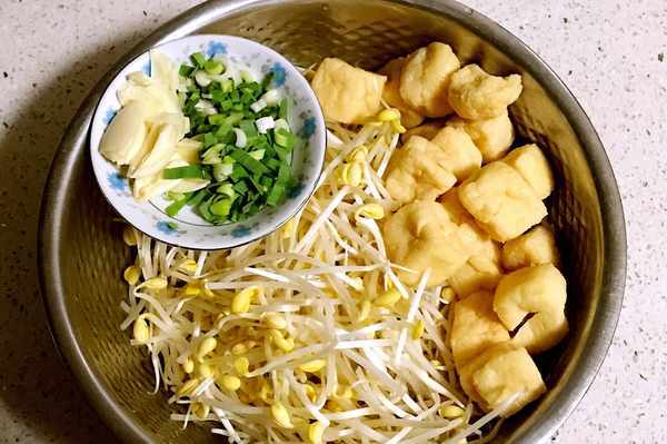 原材:黄豆芽、油豆腐、肉末、葱、姜、蒜、辣椒、各种调料