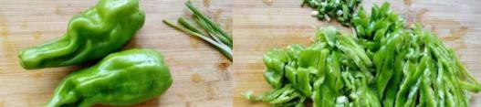 两只青椒去籽。葱切碎,青椒切细丝。