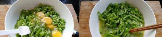 材料:青椒2个,鸡蛋4只,毛豆150克,盐1小勺,植物油2大勺