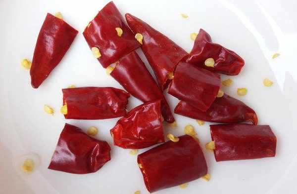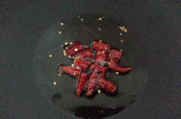油稍微热下辣椒爆香【喜欢的可以多下和加入一点花椒提味】油温不宜过高,以免辣椒马上烧黑焦