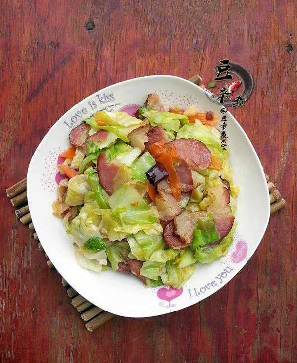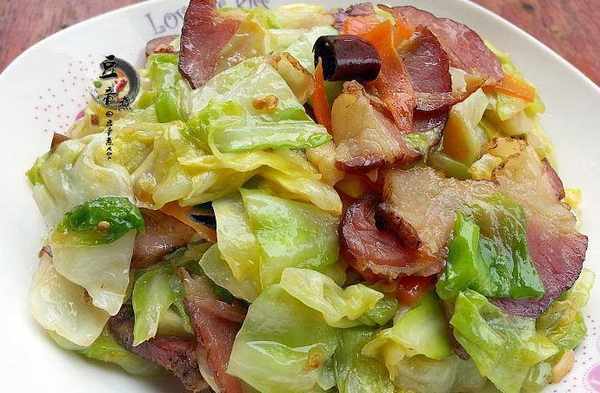材料:卷心菜1个、干辣椒4个、蒜头4个、王家五腊肉1块、红萝卜1截、