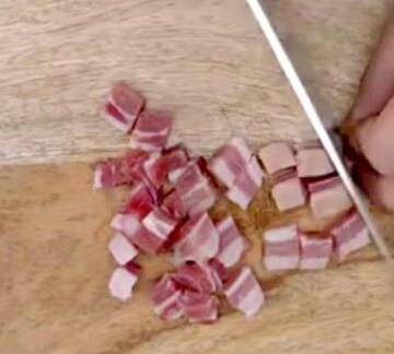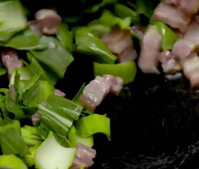 1、将咸肉改刀成小颗粒,放入沸水锅中煮熟后捞出,控水待用;青菜改刀成碎段;