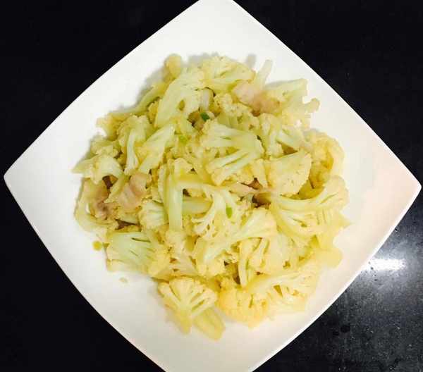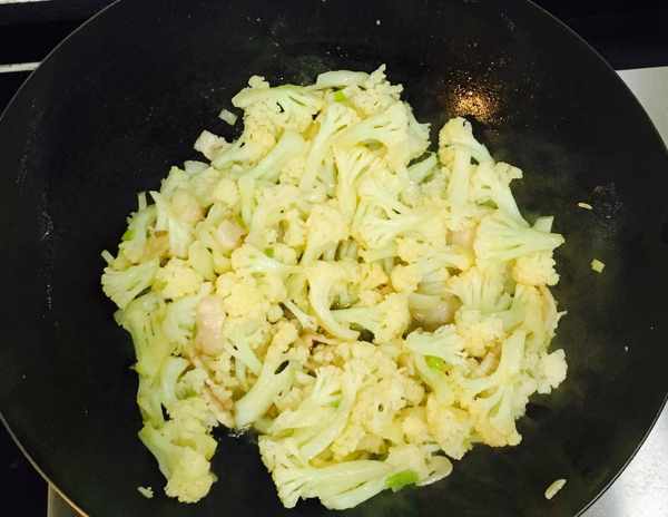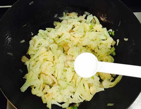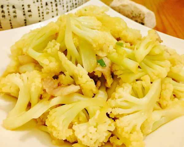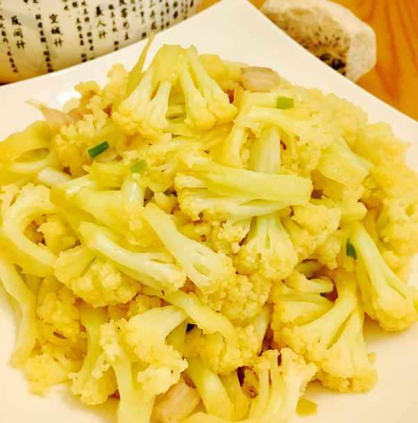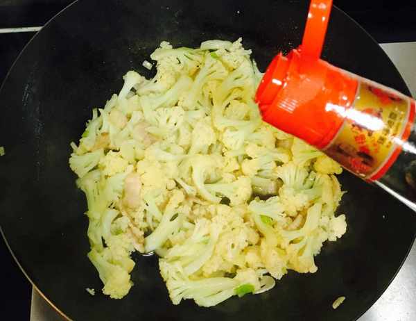 倒入花菜加适量的蚝油和盐调味,旺火翻炒均匀后关火,花菜焯过水基本断生所以不要炒制时间过长而影响口感