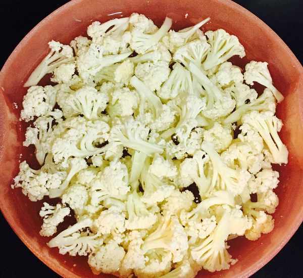 花菜一个用刀切成小块,放入容器中用清水洗净并浸泡一会儿去除农药残留