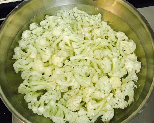 锅中加水煮沸放入浸泡过的花菜焯水30秒钟,捞出反复过凉水并沥干水分备用