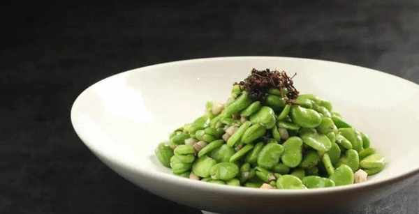 净锅后烧热油,放入蒜末爆香,下入蚕豆、肉松翻炒均匀,加入盐、鸡汁、白糖、香油调味出锅装盘后撒上炸好的橄榄菜即可。
