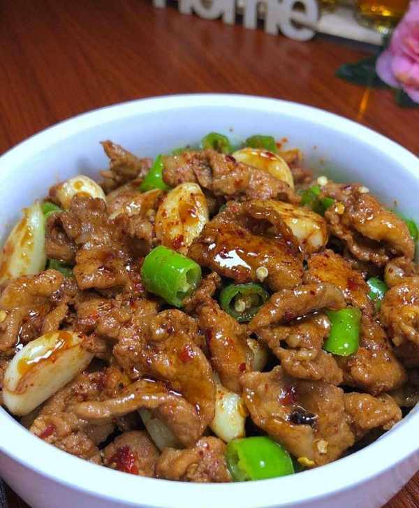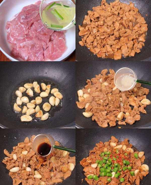 制作方法3、热锅凉油,倒入肉片炒出变色盛出,锅留底油放蒜头炒香,接着倒入炒好的肉片,加青椒粒,辣椒末,半勺老抽,最后大火翻3,4,5下即可