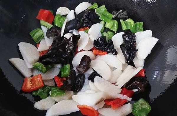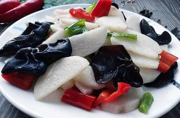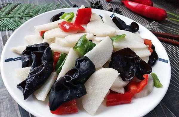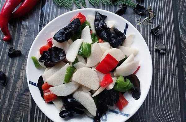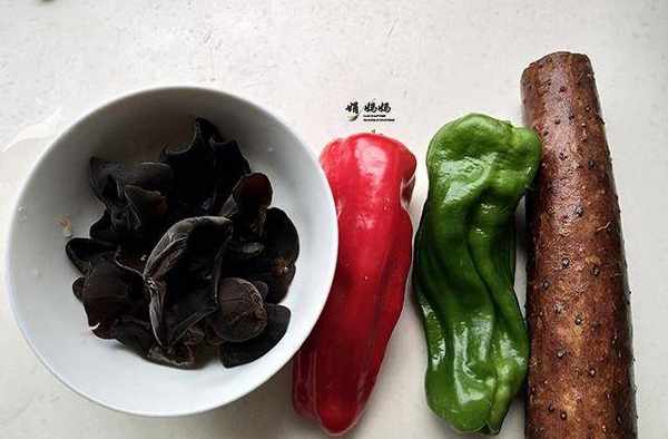 食材:脆山药1根,泡发木耳适量,青红胡椒各准备一根,大蒜2粒,盐5克,味精2克,白糖2克。