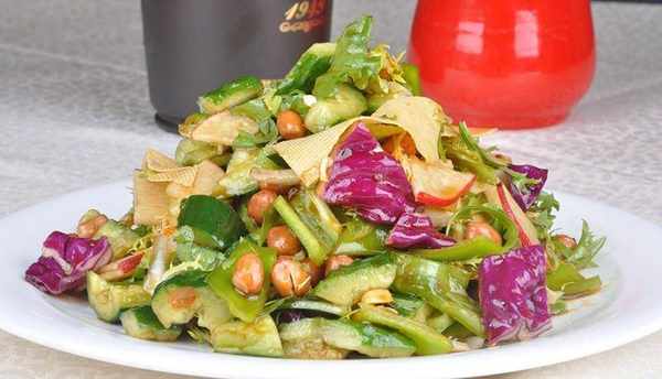 豆皮、青瓜、紫甘蓝、香菜、油炸花生米、心里美萝卜、香油、辣椒油、生抽、香醋、盐