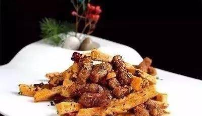 牛柳200克,香豆腐150克,干辣椒节、芽菜各5克。