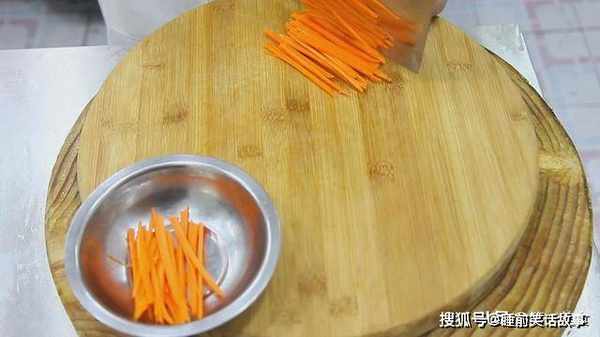 胡萝卜一小块,清洗干净以后切成细丝,尽量把红萝卜丝切细一点,容易入味,口感好。