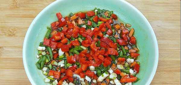 6、把切好的胡萝卜丁、葱花、彩椒,一起放入盘中,搅拌一下,使盐均匀的然后