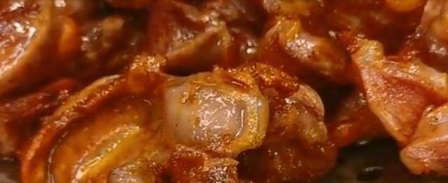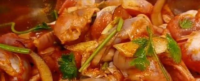 首先,准备好鸡胗改刀一破两半,放入盆里,加入葱姜适量,洋葱丝,香菜,加入奥尔良烤翅腌料,用你发财的左手抓拌均匀,再适量来点红酒,再用你的左手完全的抓拌均匀,腌制15分钟,然后把鸡胗捡出来!