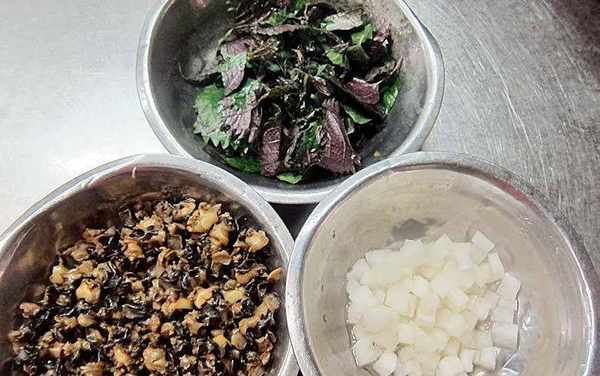 原料:鲜螺肉250g鲜紫苏叶75g酸萝卜丁50g