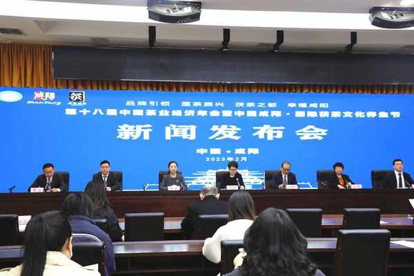 2月20日上午,第十八届中国茶业经济年会暨中国咸阳·国际茯茶文化养生节新闻发布会在陕西咸阳举行。咸阳市委常委、市政府副市长李慧超,中国茶叶流通协会秘书长肖星, 咸阳市供销合作社主任蒙群,咸阳市贸促会副会长兼秘书长加晓刚,泾阳县政府副县长崔巍出席本次发布会,向社会各界介绍了各项工作的筹备情况,以及第十八届中国茶业经济年会总体活动安排。