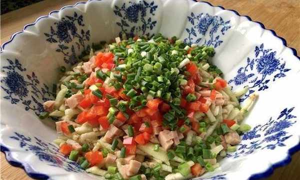 (2)、全部切好的茄子,需要装入一个大碗中。接着我们还要准备半块午餐肉,把午餐肉切片,再切成细丁状加入碗中。然后还要准备一个红椒,把红椒清洗干净去籽,切成细丁加入碗中。最后还要准备上适量小葱,切成葱花也加入到碗中。