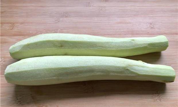 (1)、首先我们要准备两个茄子,准备好的茄子,用水把茄子清洗干净后,再用削皮刀把茄子外面的外皮给削掉。因为茄子的外皮肉质是很老的,不太适合用来制作这道美食。削皮以后的茄子,需要用刀将其切成薄片状,再切成细丝状。