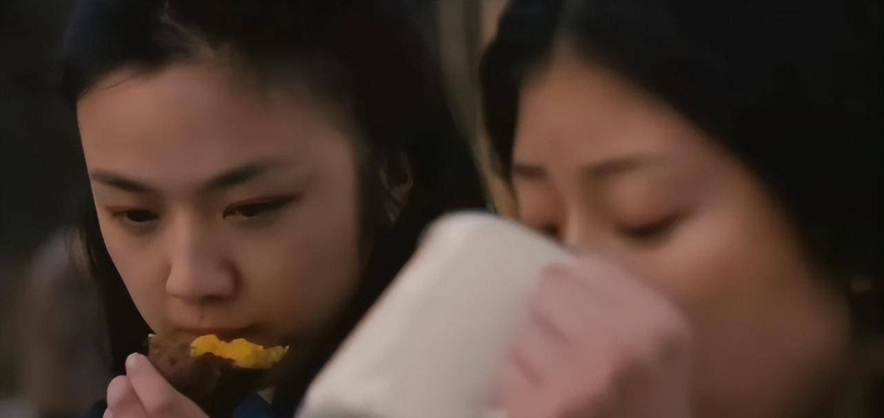寒天清早,人行道上有人生着火炉,滚烫的红薯冒着热气,不断有路人停留驻足买上一个。