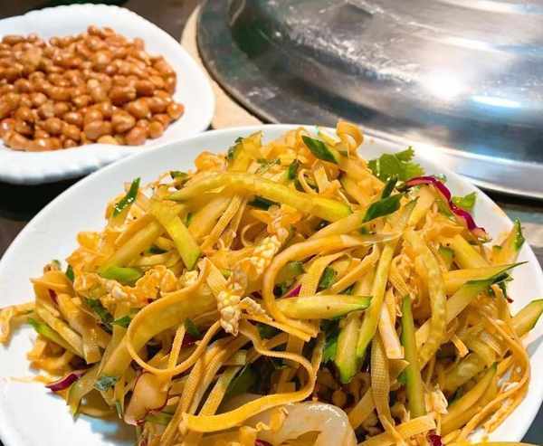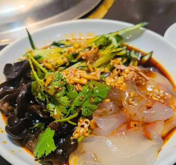 光吃肉是很油腻的,接下来的菜是一道凉拌菜,有黑木耳,有香菜,有黄瓜丝,有凉皮,各种食材混合在一起,咸香开胃很是美味。