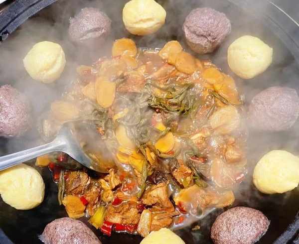 桌子中间有个大铁锅,老板将排骨干菜放入了锅里,又将黄色和紫色的面饼贴在锅边上,刘欣舟和朋友二人还是第一次看见这样的菜肴。