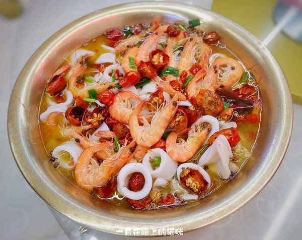端上桌就闻到水煮海鲜的那个香味,口水都流下来了。汤汁麻辣鲜香,小鱿鱼每一个都Q弹脆嫩,虾也很新鲜,浸泡在汤汁里很入味,里面的配菜黄瓜、木耳和花菜吸收了汤汁的味道也很好吃,真不愧为水煮小鱿鱼的鼻祖。