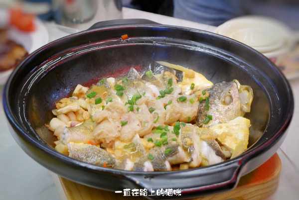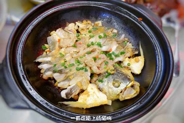 黄鱼切成了片,中间部位还放上了米肠,厚实的砂锅焗的做法更能激发黄鱼的鲜甜,豆酱的加持味道更丰富。