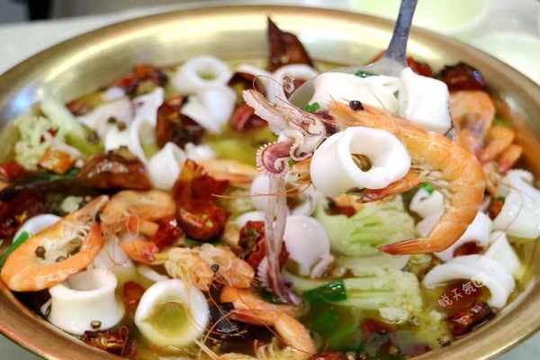 每桌必点的水煮小鱿鱼,加了半斤虾,一如既往保持了20年的好味道!食材的新鲜度毋庸置疑,小鱿鱼质地洁白,软嫩好吃,虾肉Q弹饱满,作为配菜的花菜和黑木耳,也是爽脆可口,至于水煮的辣度也不会很冲,符合本地人的口味。