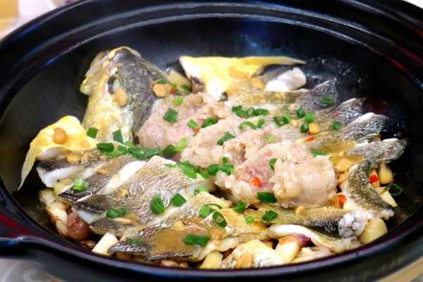 豆酱焗黄鱼,鱼肉鲜嫩入味,点缀的米肠也好吃,太解馋了!