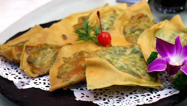 韭菜饼,7元一个,外壳酥脆,馅料鲜美,咬一口满嘴香。