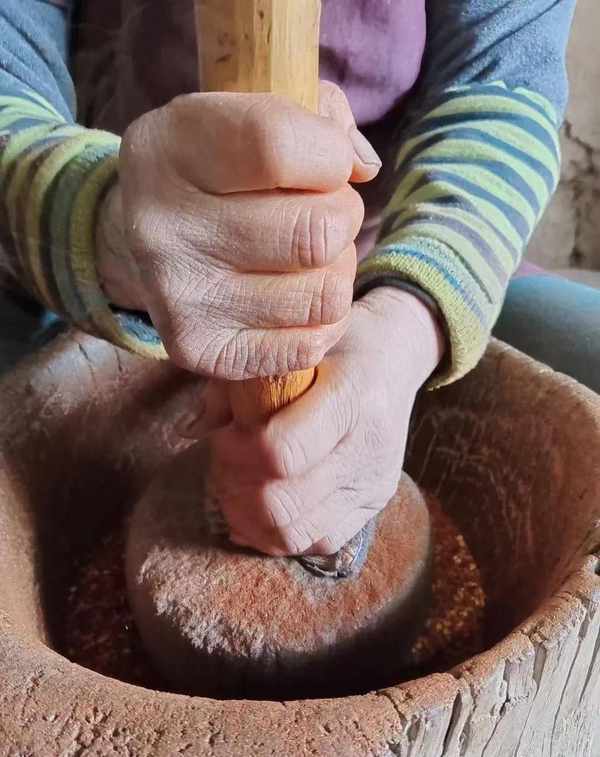 三是洗窝要用木砟和石砟锤,很费力,也很必要。通过石锤的上下活塞运动,将油炸辣椒的各部分上下打碎,直至细碎。改变